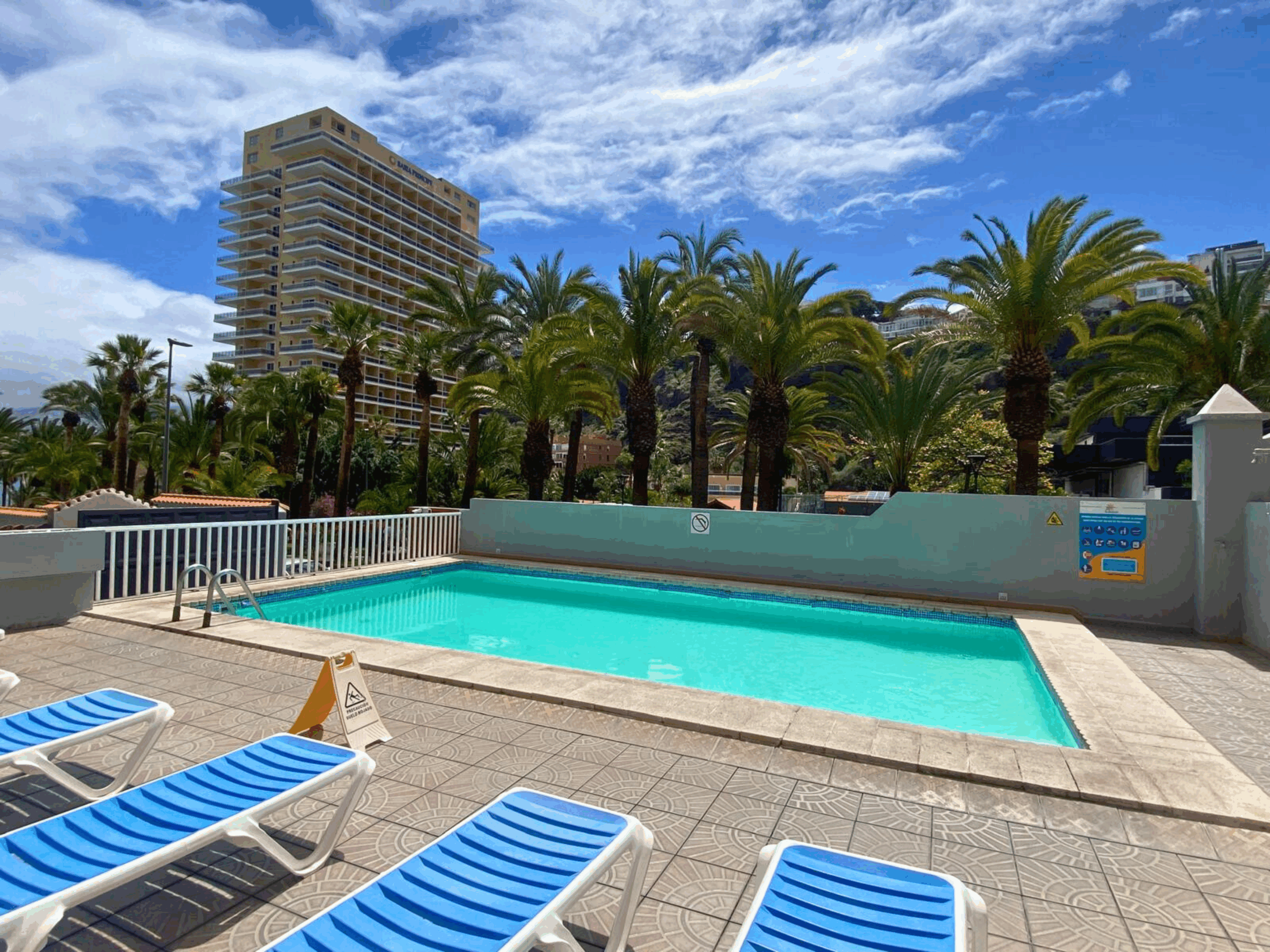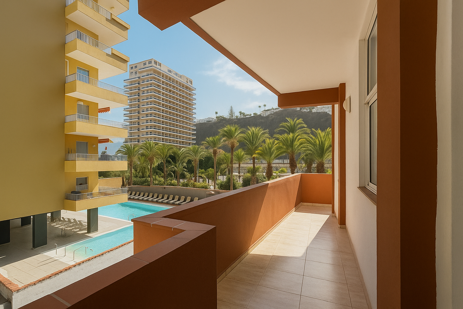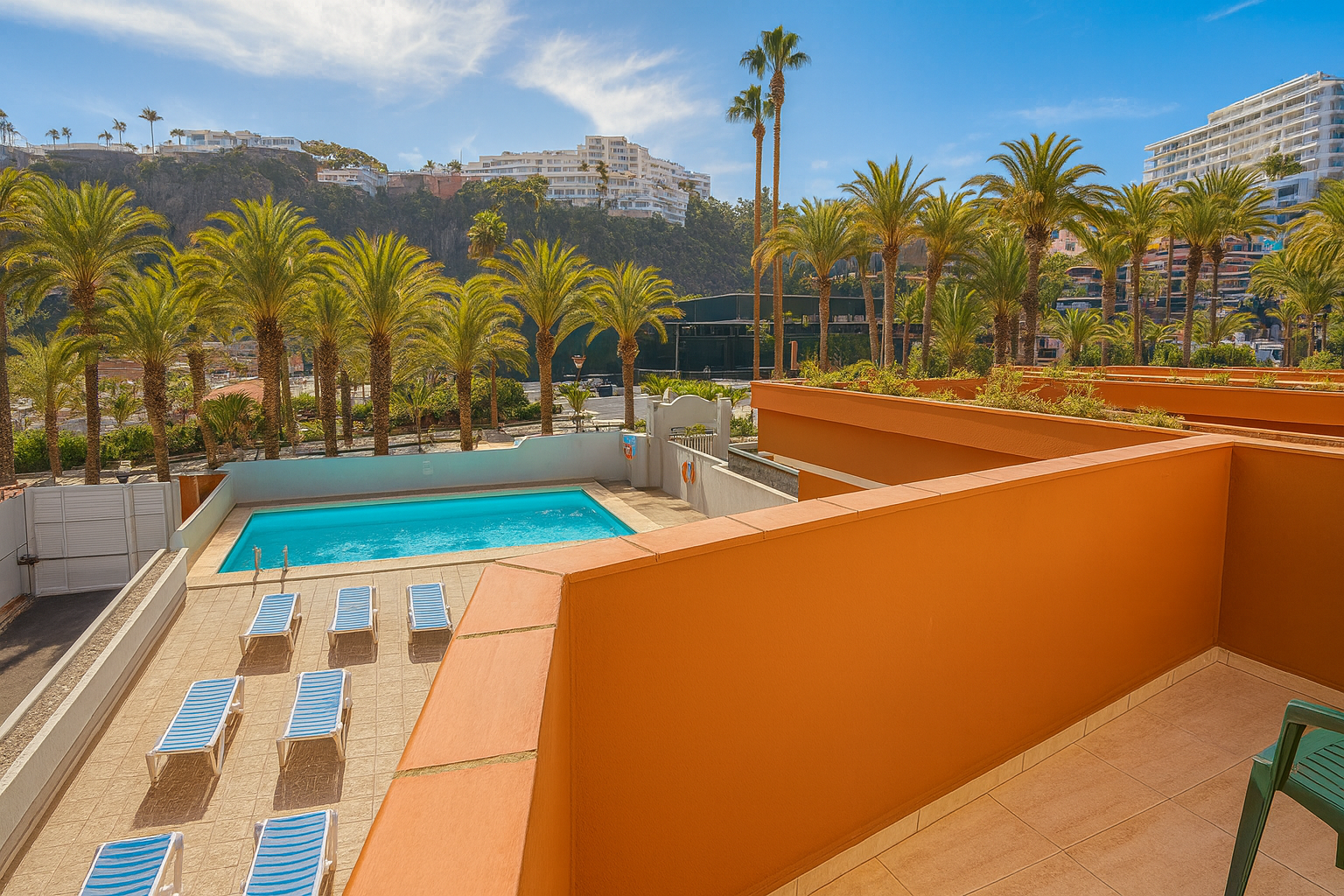- Balcón principal (aprox. 15 m²): vistas a la piscina y al paseo de Las Palmeras (frontal),