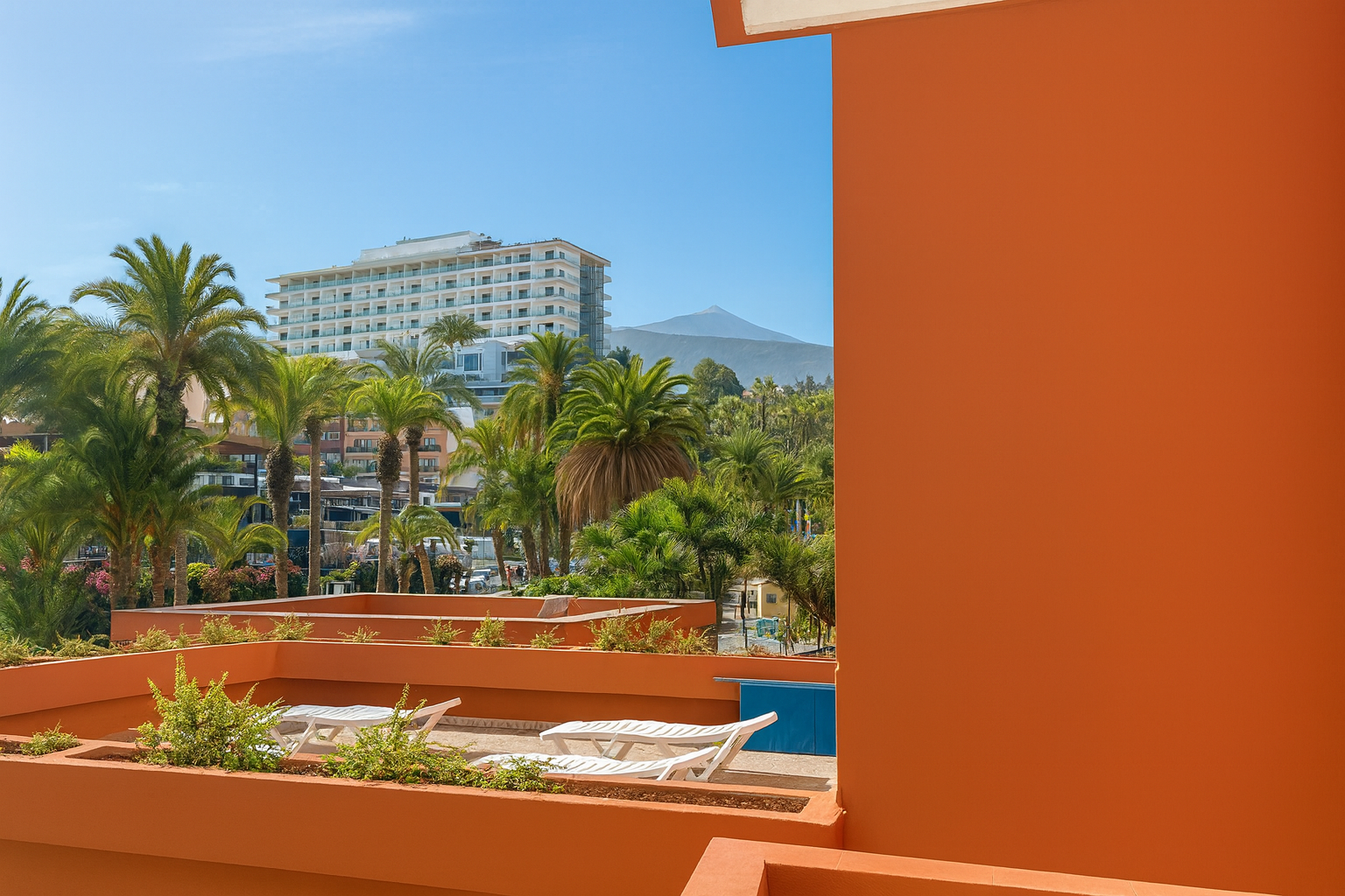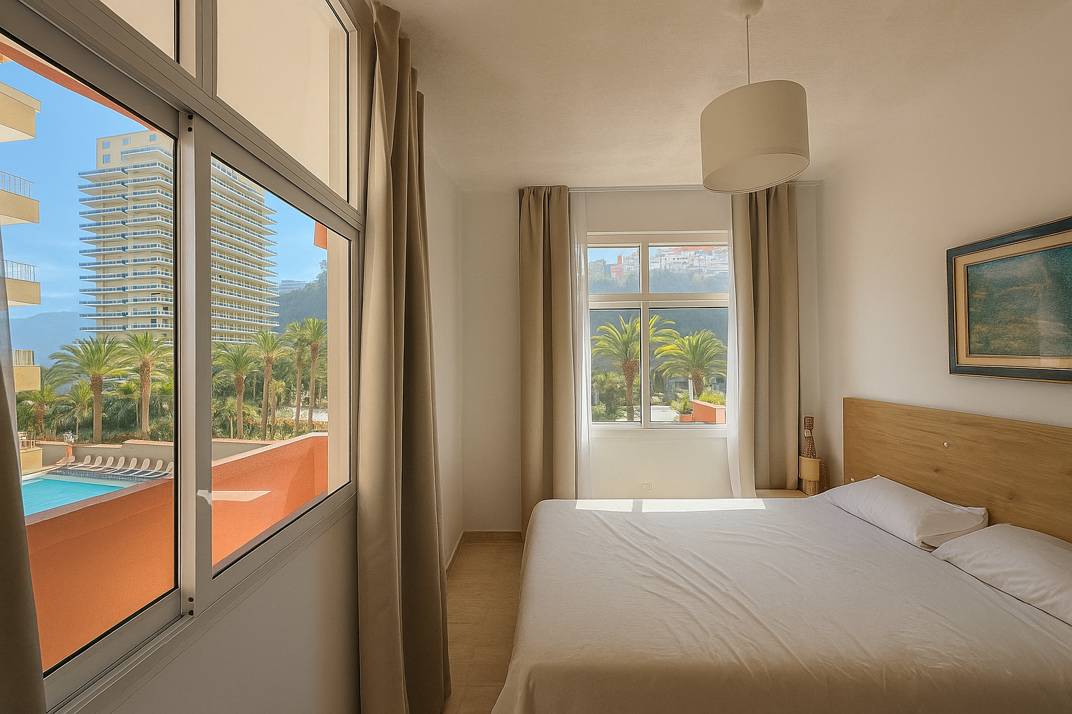 vistas laterales al océano y a la costa acantilada (lado izquierdo) y al Teide (lado derecho). - Dormitorio 1: amplio, con acceso al segundo balcón privado (aprox. 5 m²), ideal para momentos