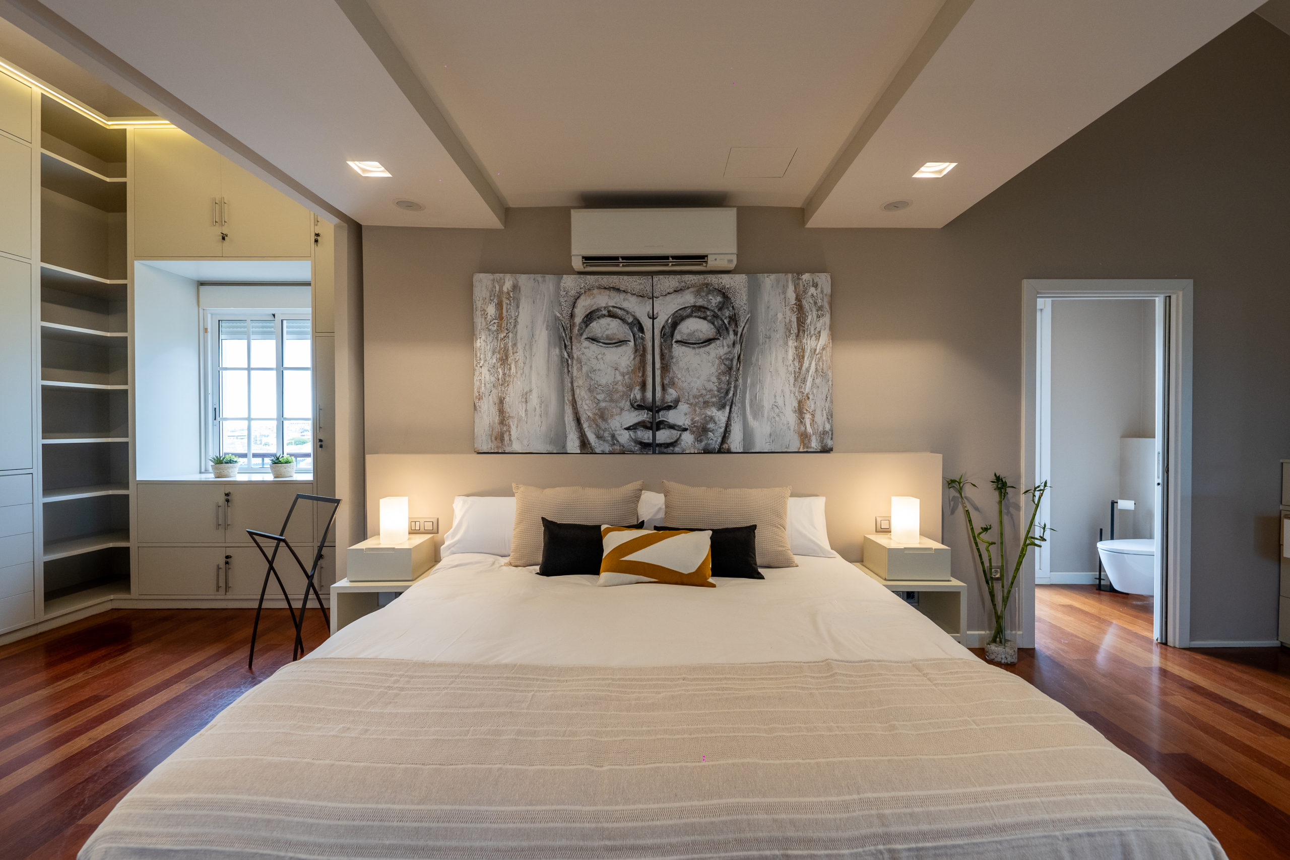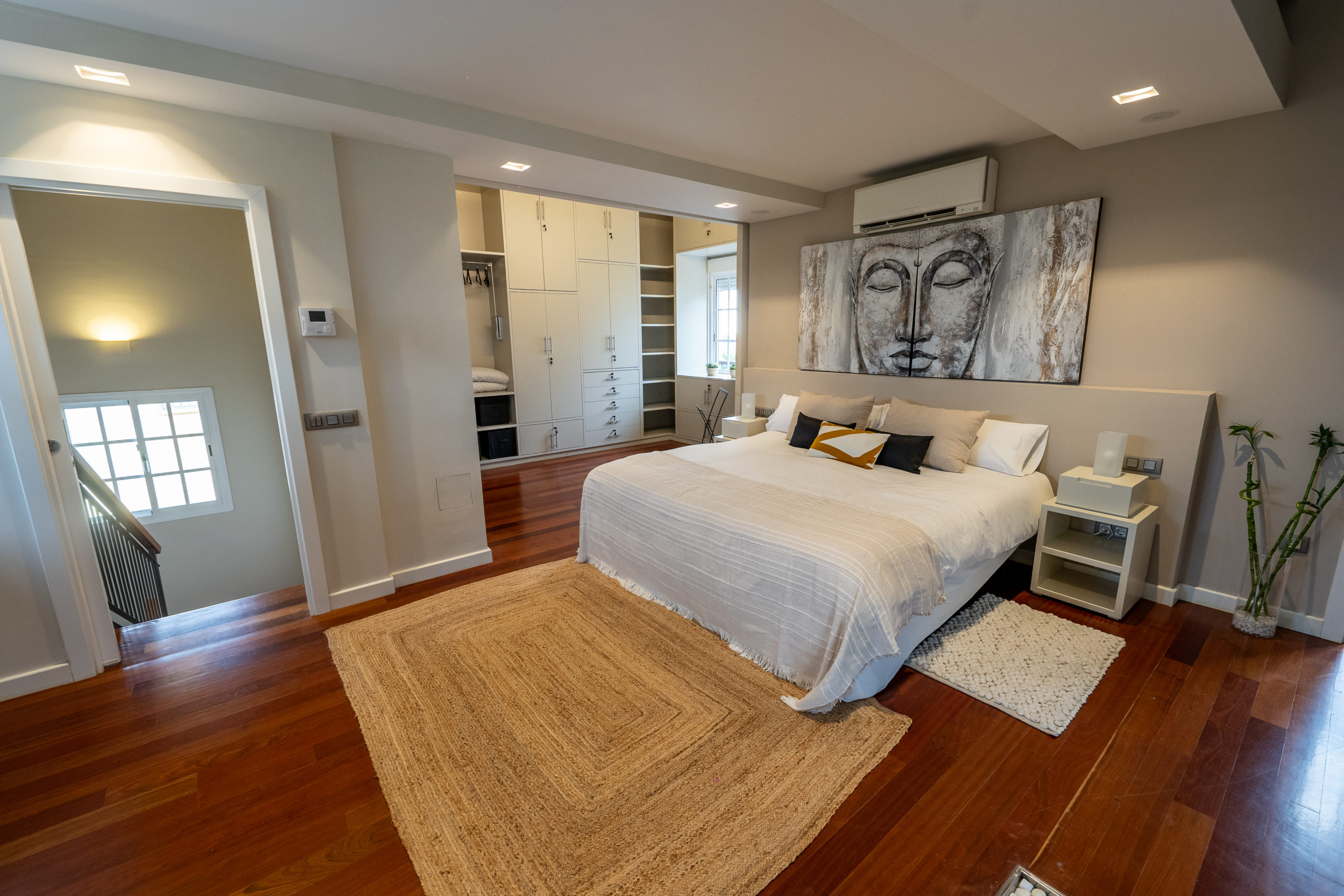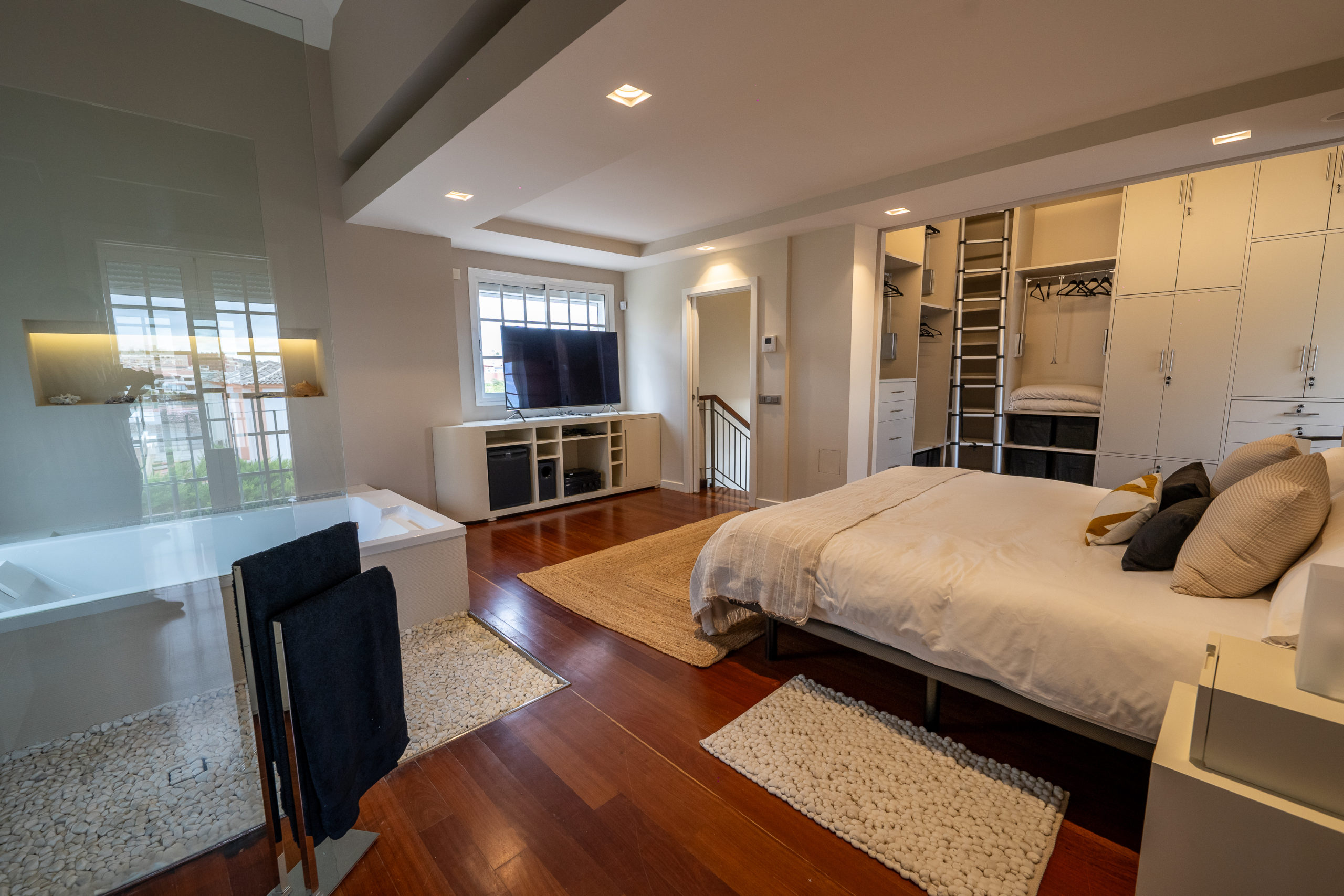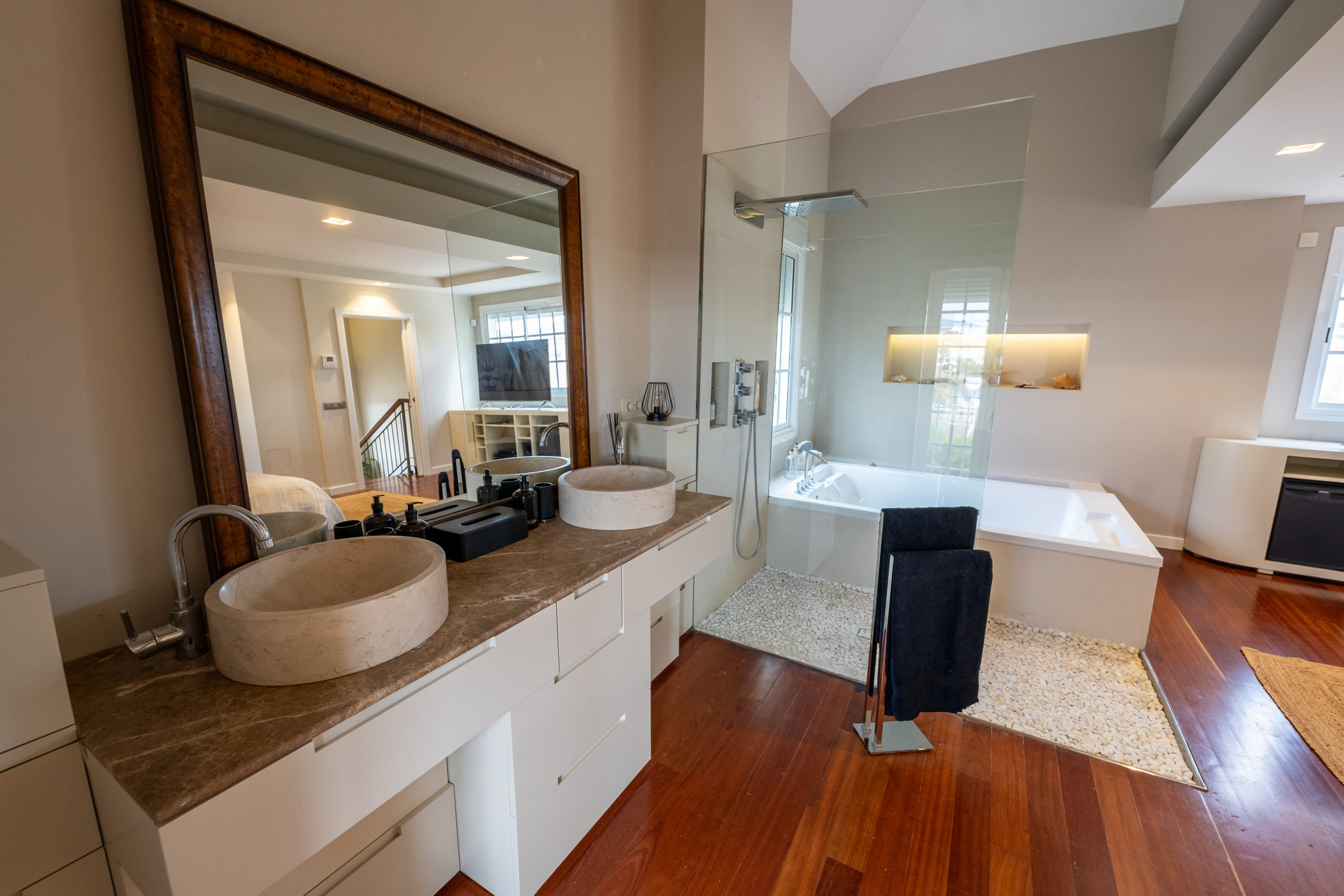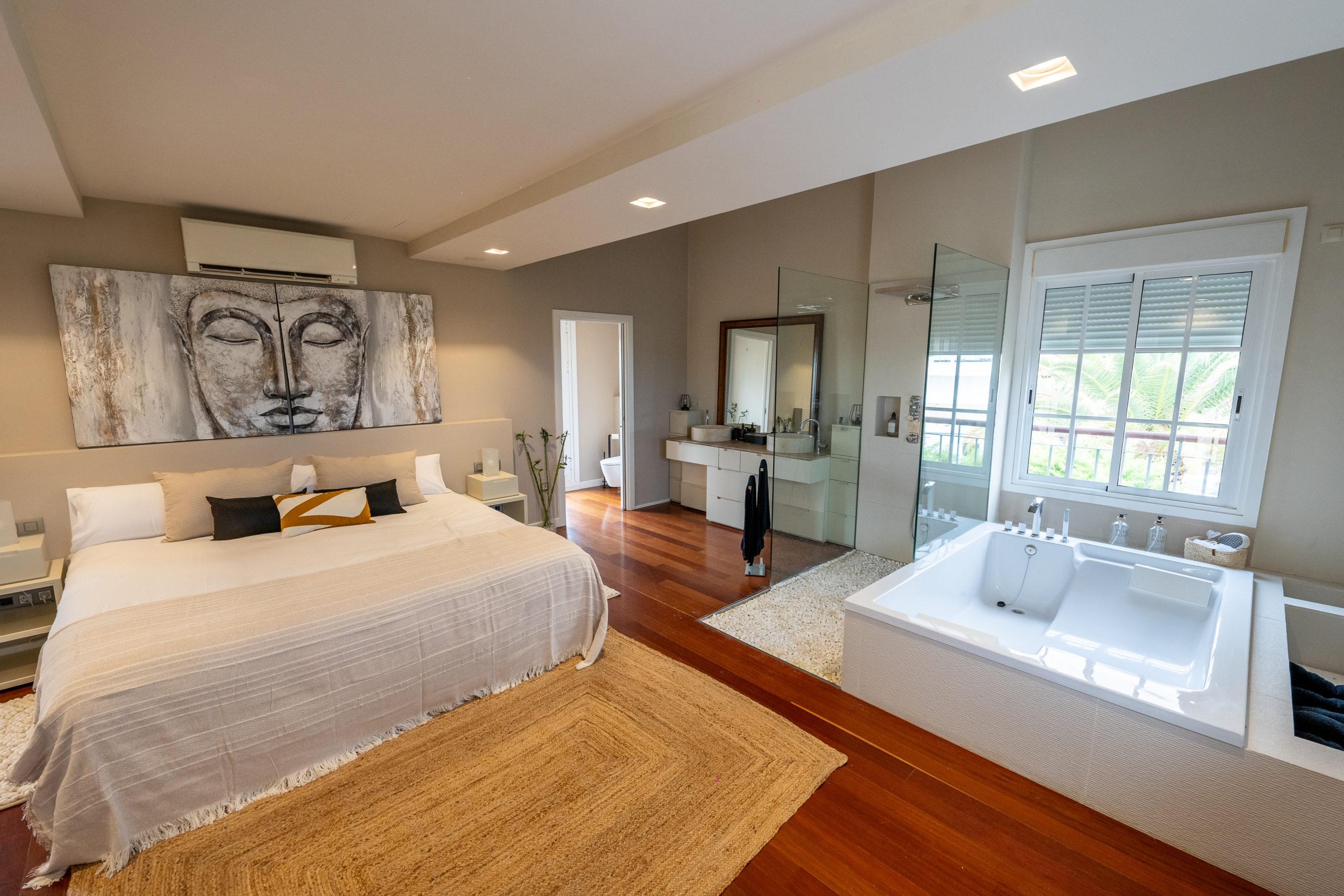 Główna sypialnia z łazienką en suite wyposażoną w prysznic i wannę, a także dodatkowa toaleta.